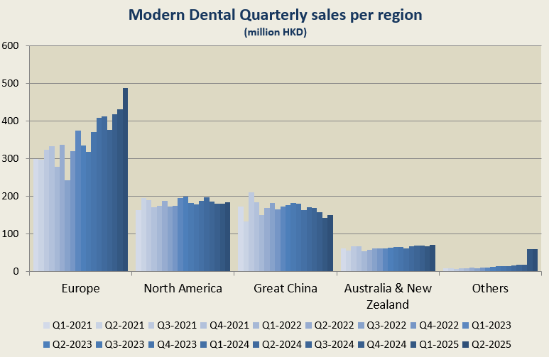 As we can see the European region is really on fire, whereas North America continues to disappoint, and Great China (with a lot of Hong Kong exposure) is even declining. From a low level, AU/NZ is growing nicely and Others growth is related to the acquisition of Thai dental lab Hexa ceram, more on that later.