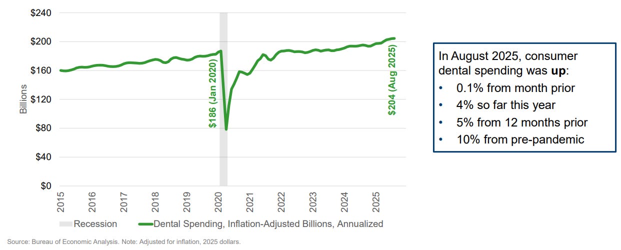 The dental industry has been touted as a nice growth industry with boomers retiring and needing more dental services. Numbers like 5% CAGR have been thrown around for a long time. That might be true in some parts of the world like Europe. This has not materialized in the US in the past years, it’s rather been Covid hangover, which has been surprising to me and many others. Somehow, the US economy is running hot and stocks are taking all time highs, but the general broader consumer is hurting and can’t afford dental bills. Looking at data for the US, some tiny light can be seen in the tunnel with an uptick very recently: